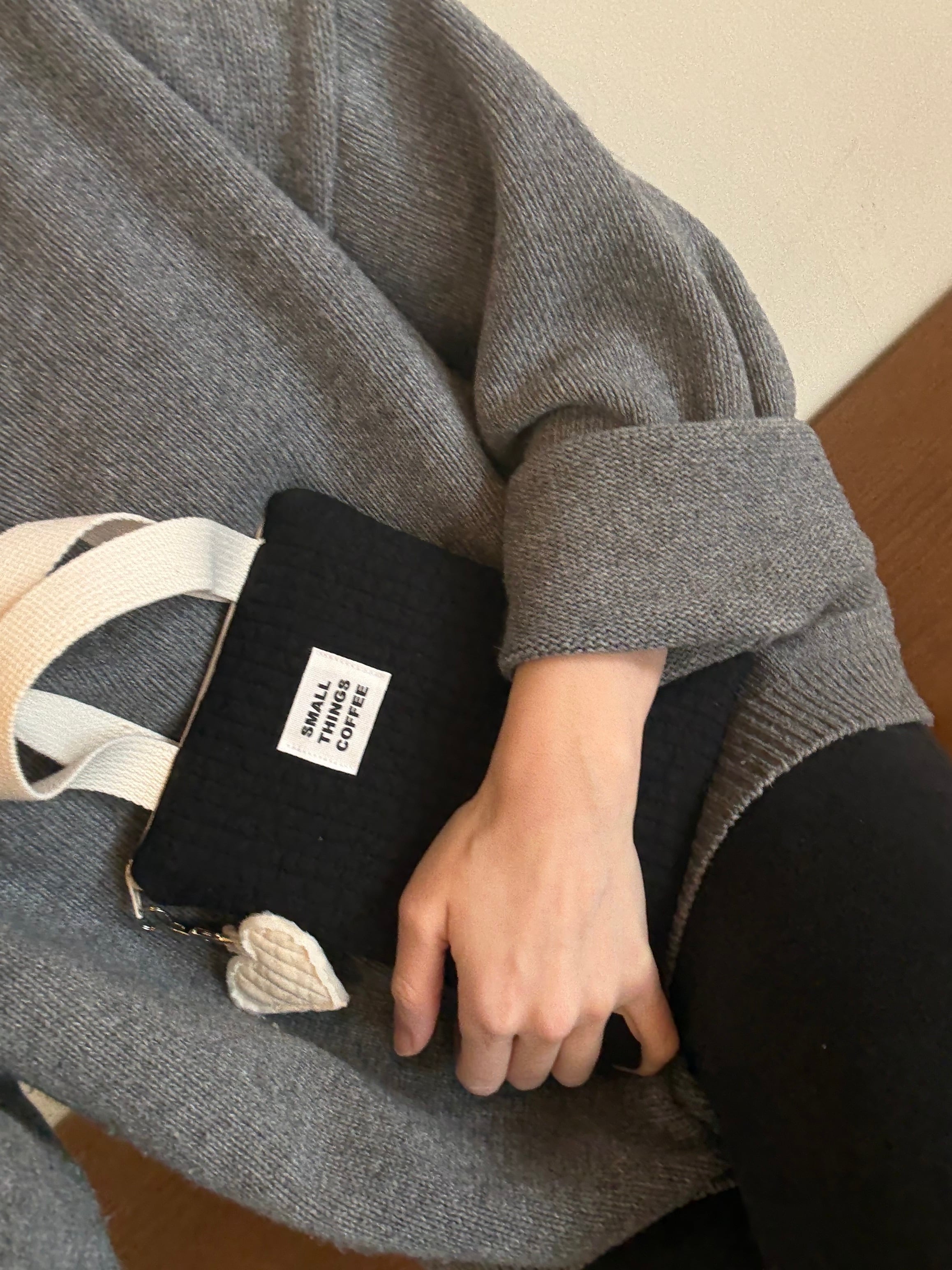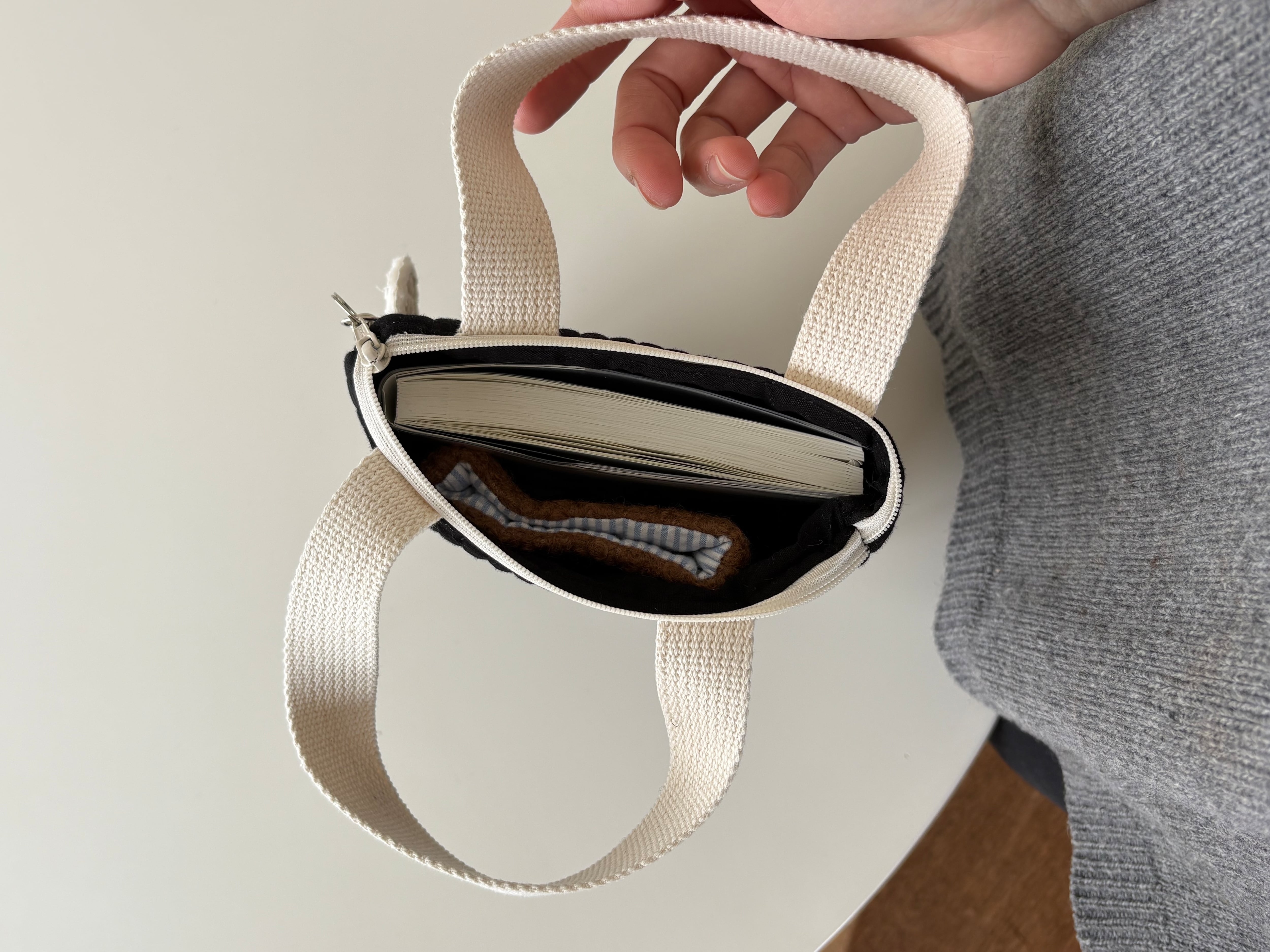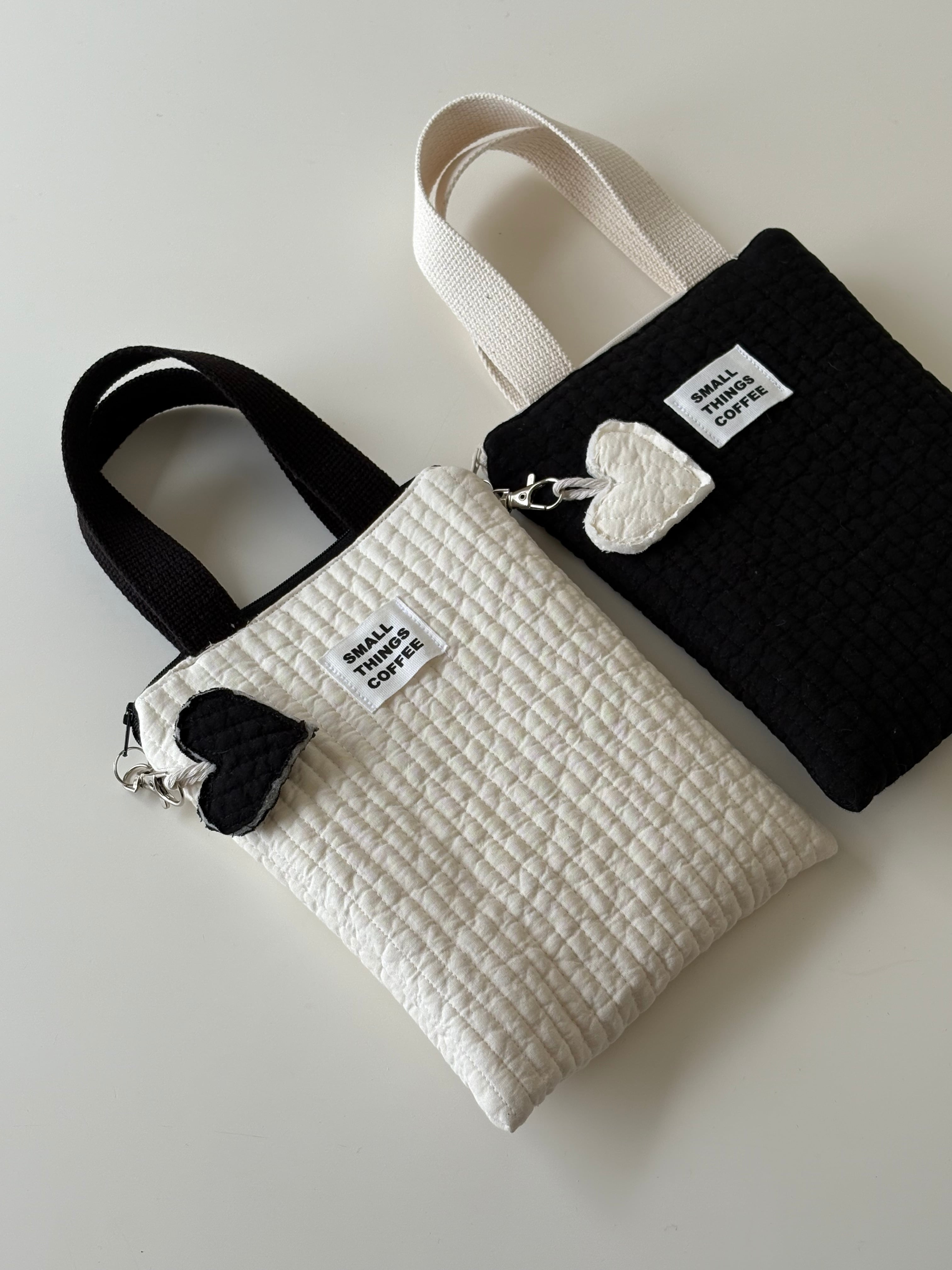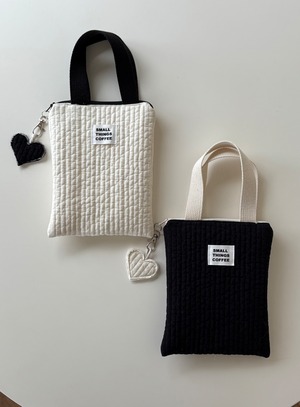 ヌビ生地を使用してポーチでもバックでも使えるように制作しました。B6サイズで本やダイアリーなど入れることができます。ハート形のキーリングもつけました。 ヌビ生地は、韓国の伝統的なキルティング生地で、ふんわりとした厚みがあります。 color : cream, black size : 16 x 21
