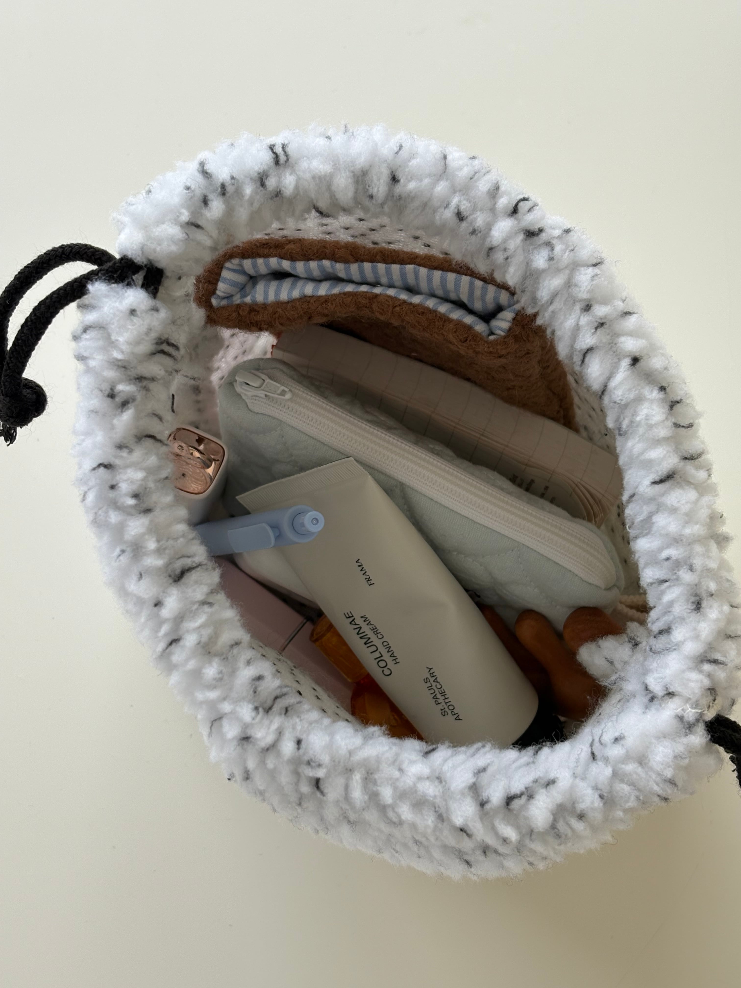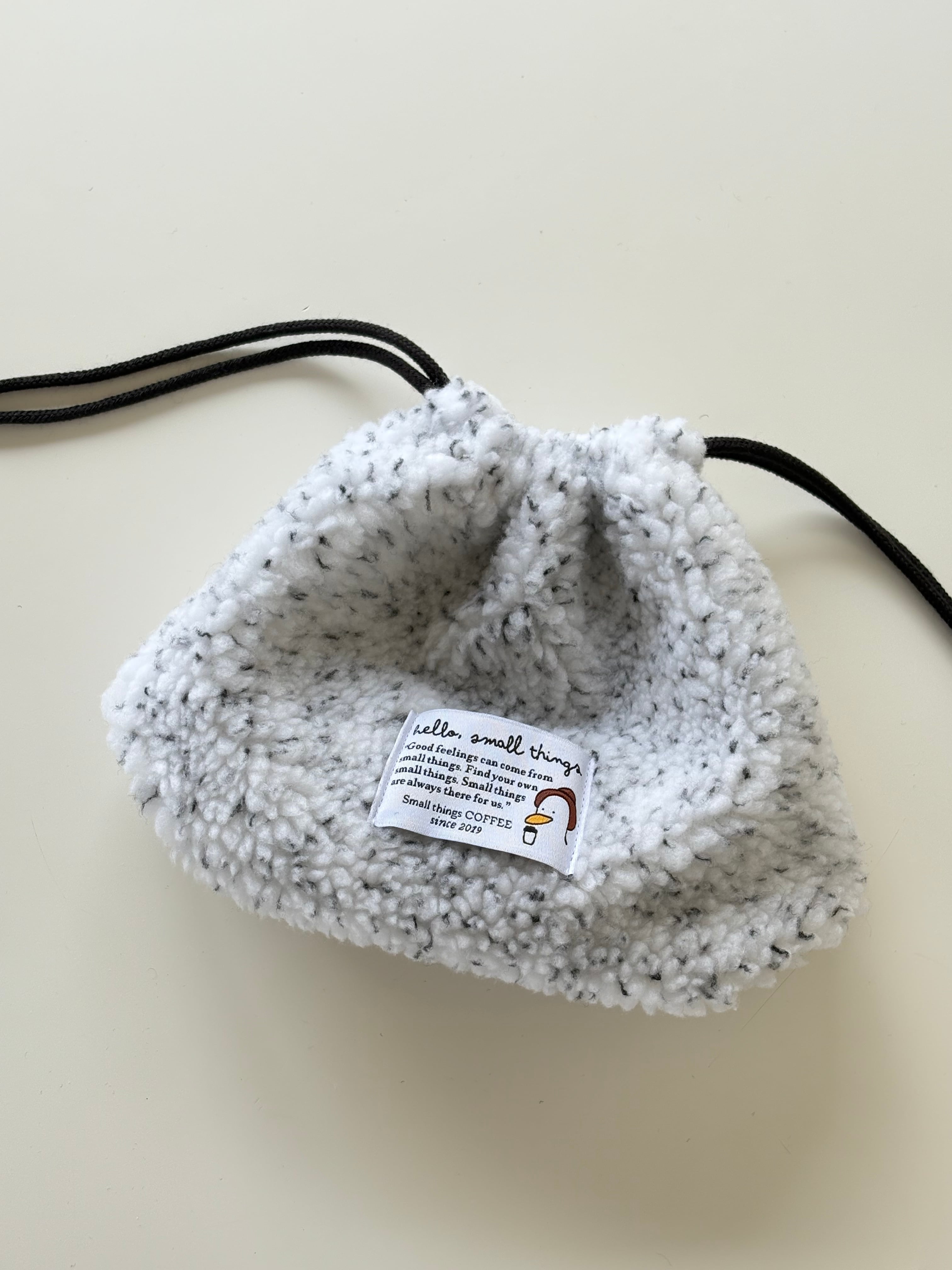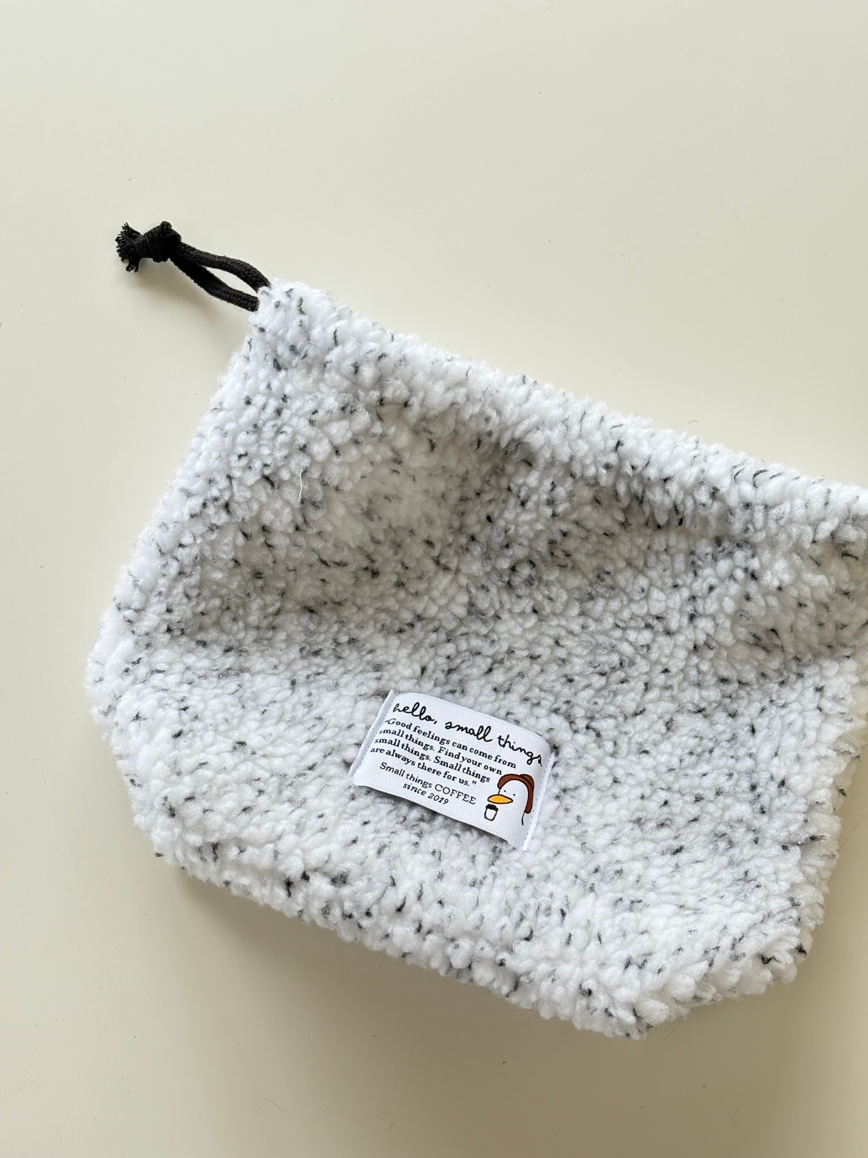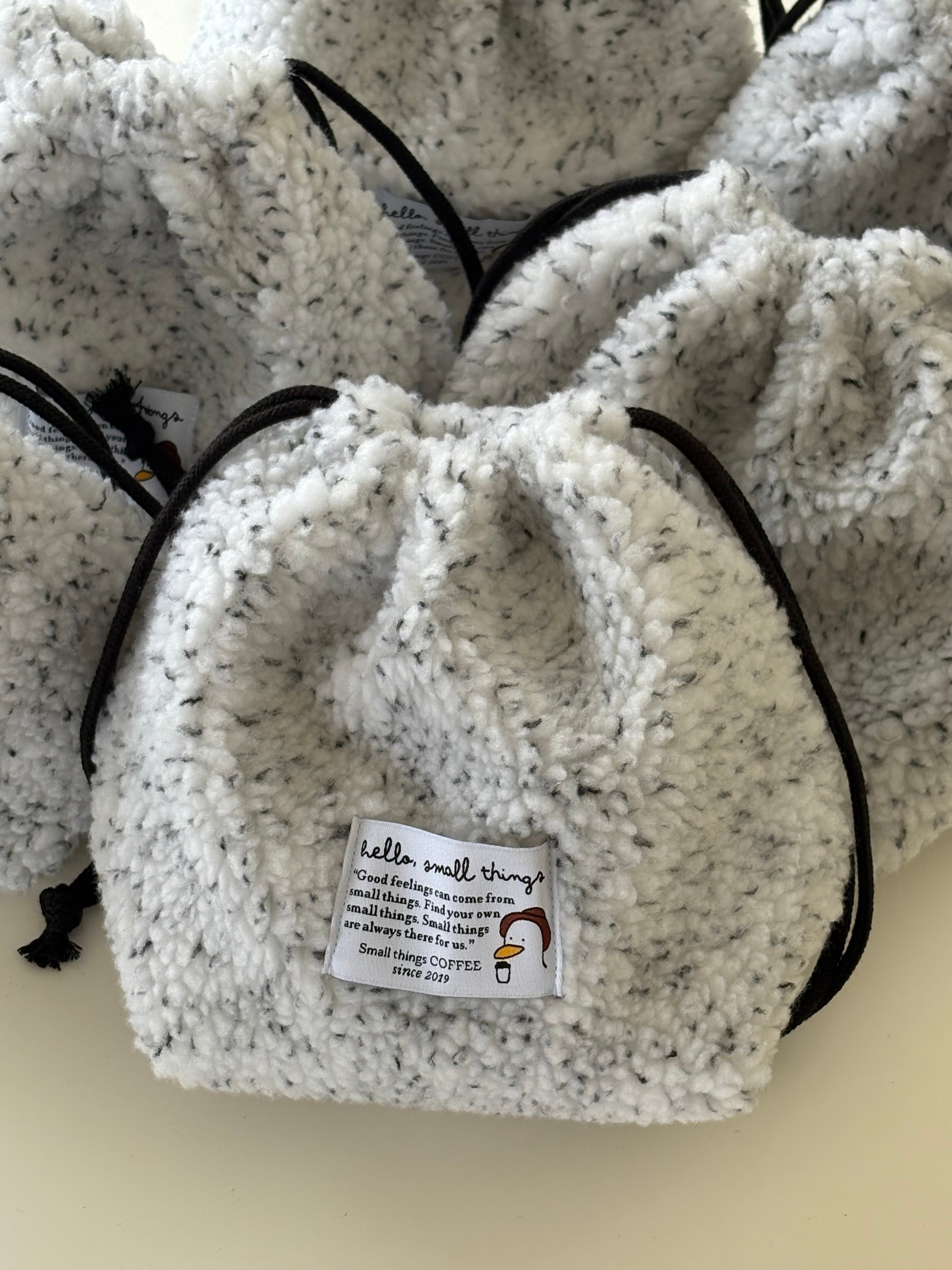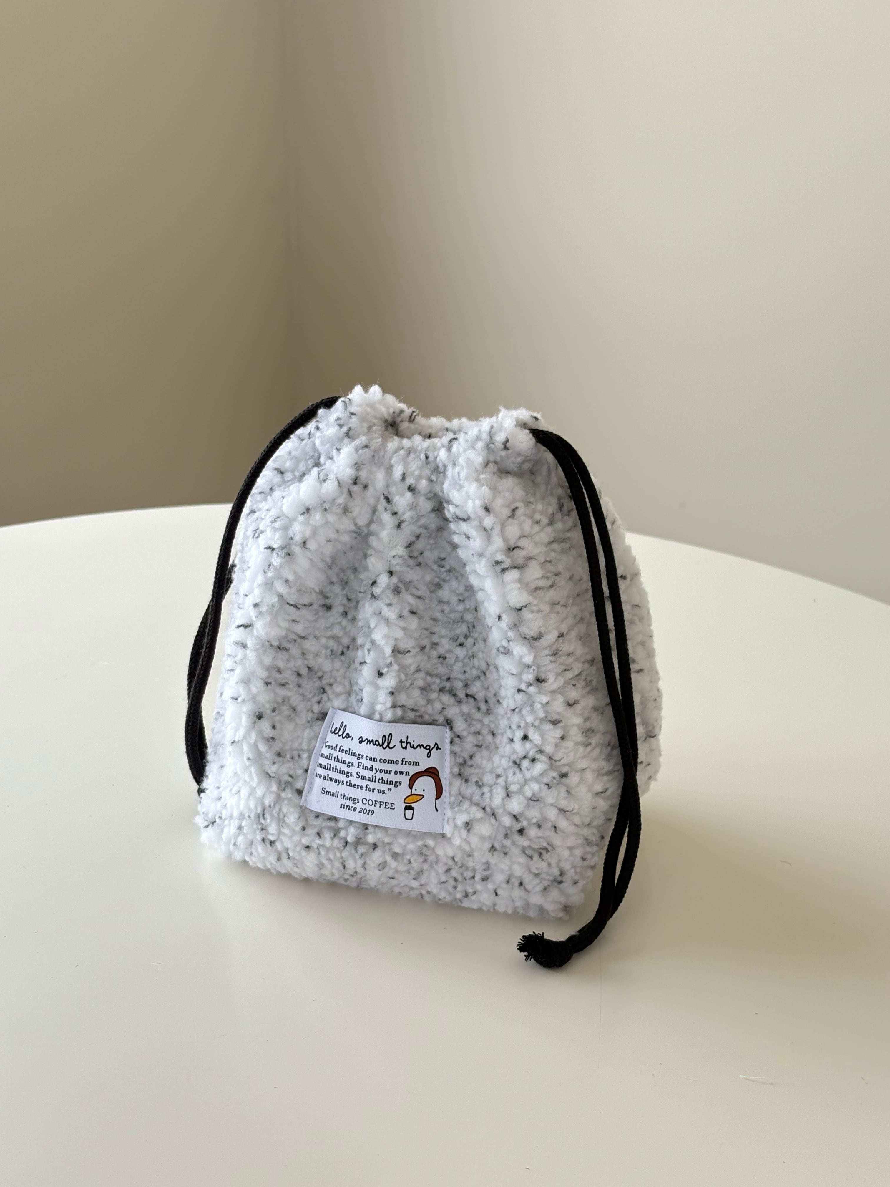 いつもの巾着ポーチを今回は冬にぴったりのもこもこ生地を使用して作りました。厚みがあってふんわりした生地なので、バッグとして使うのもおすすめです。 color : white size : 17 x17