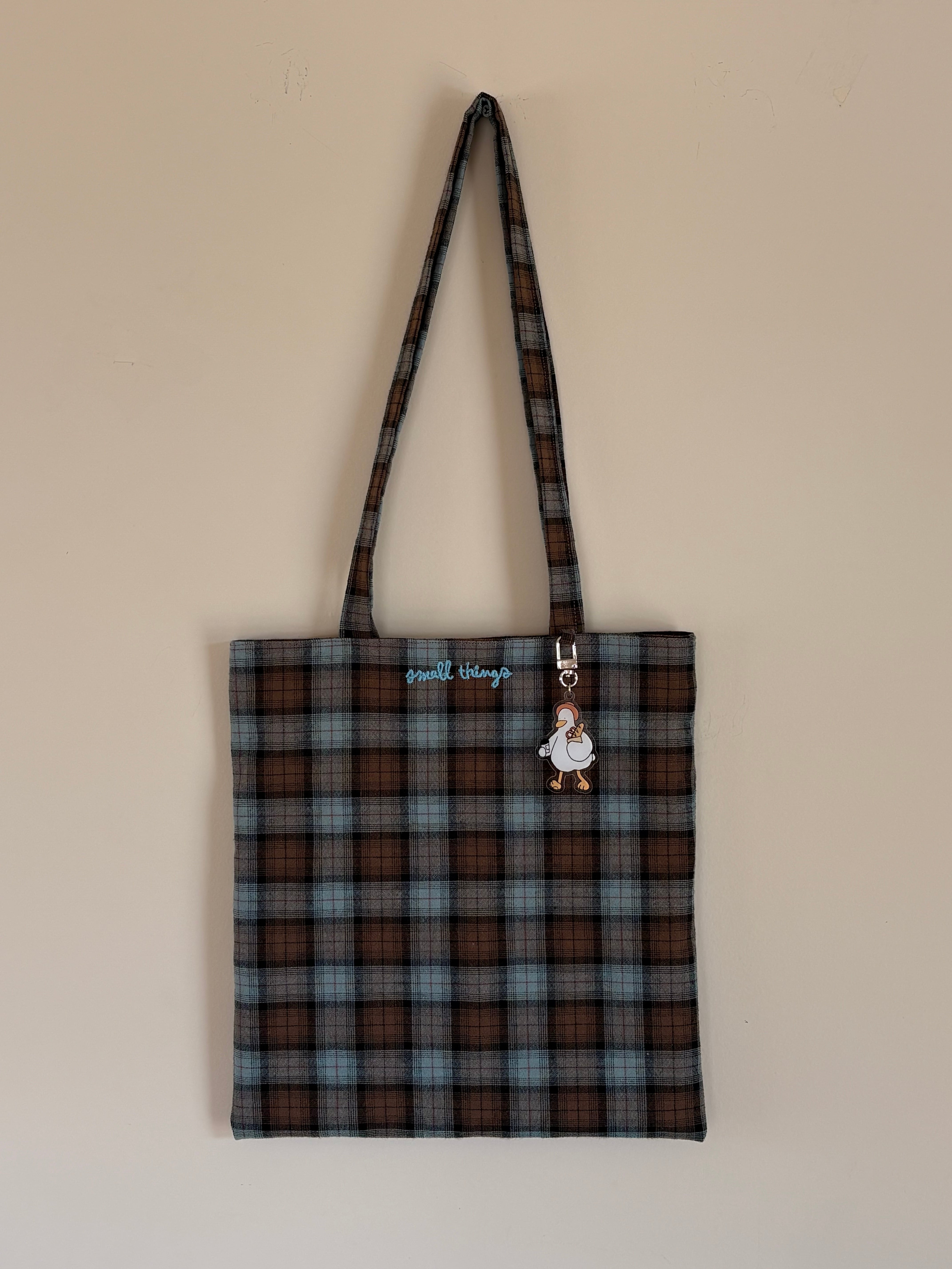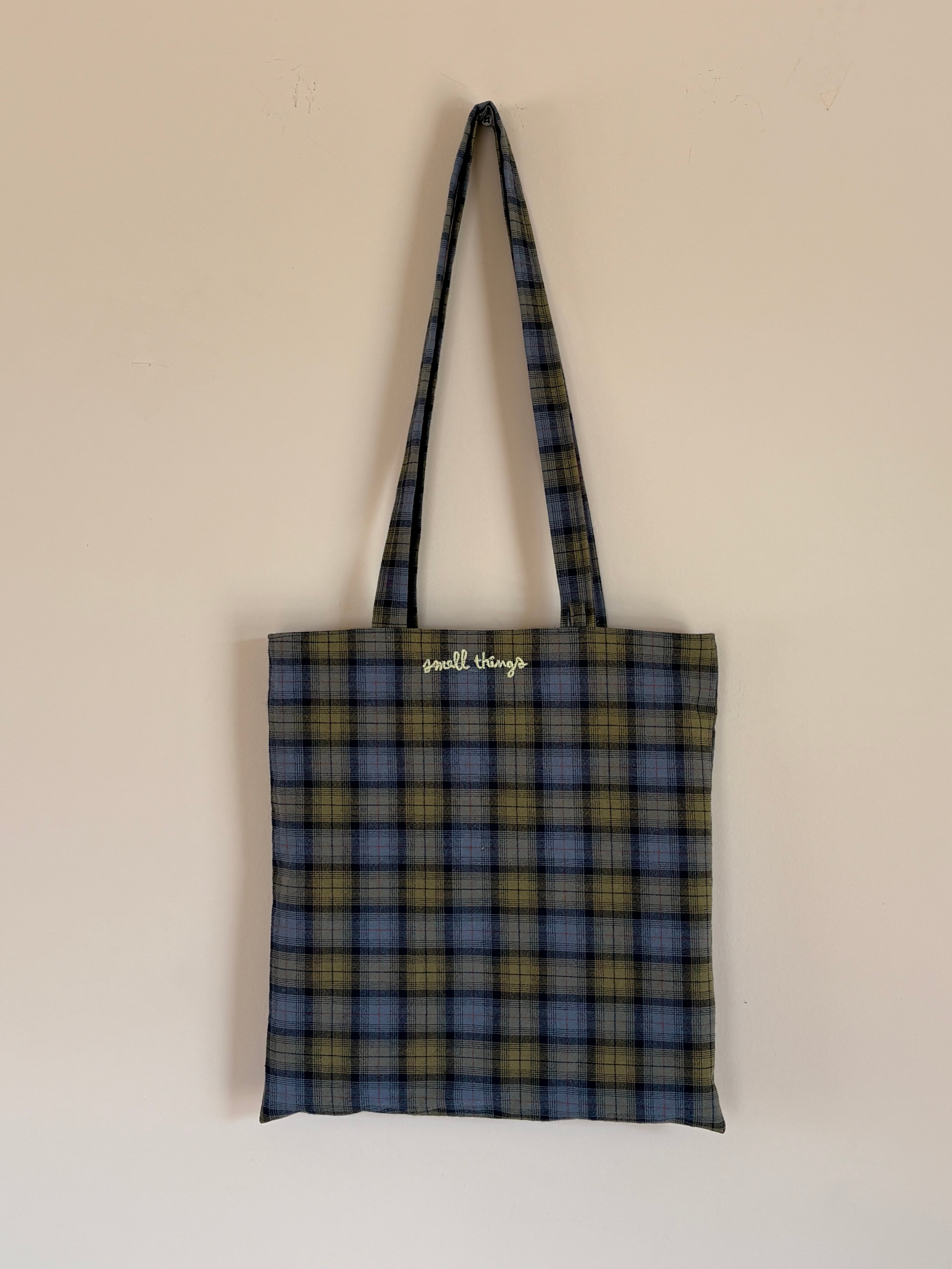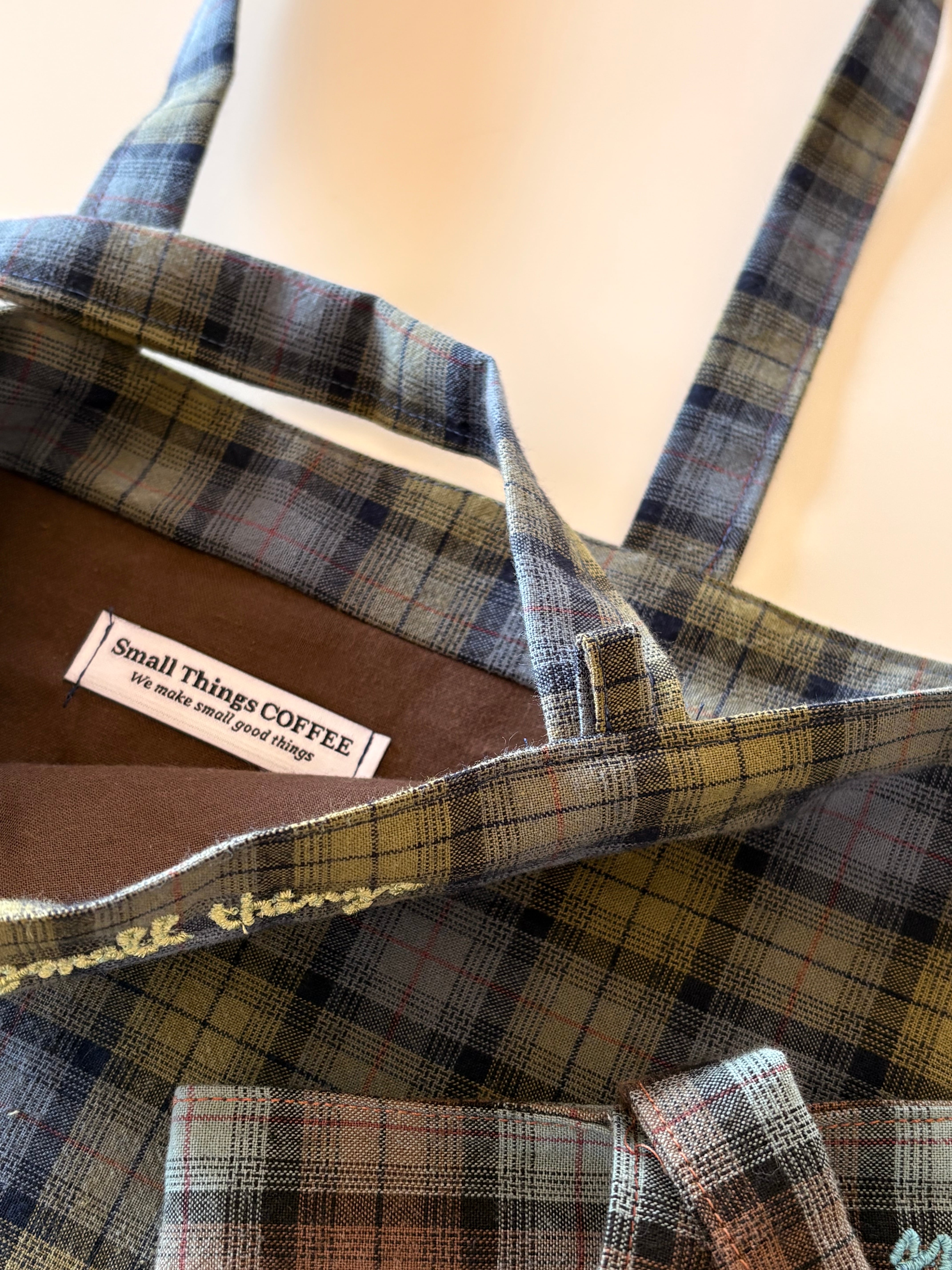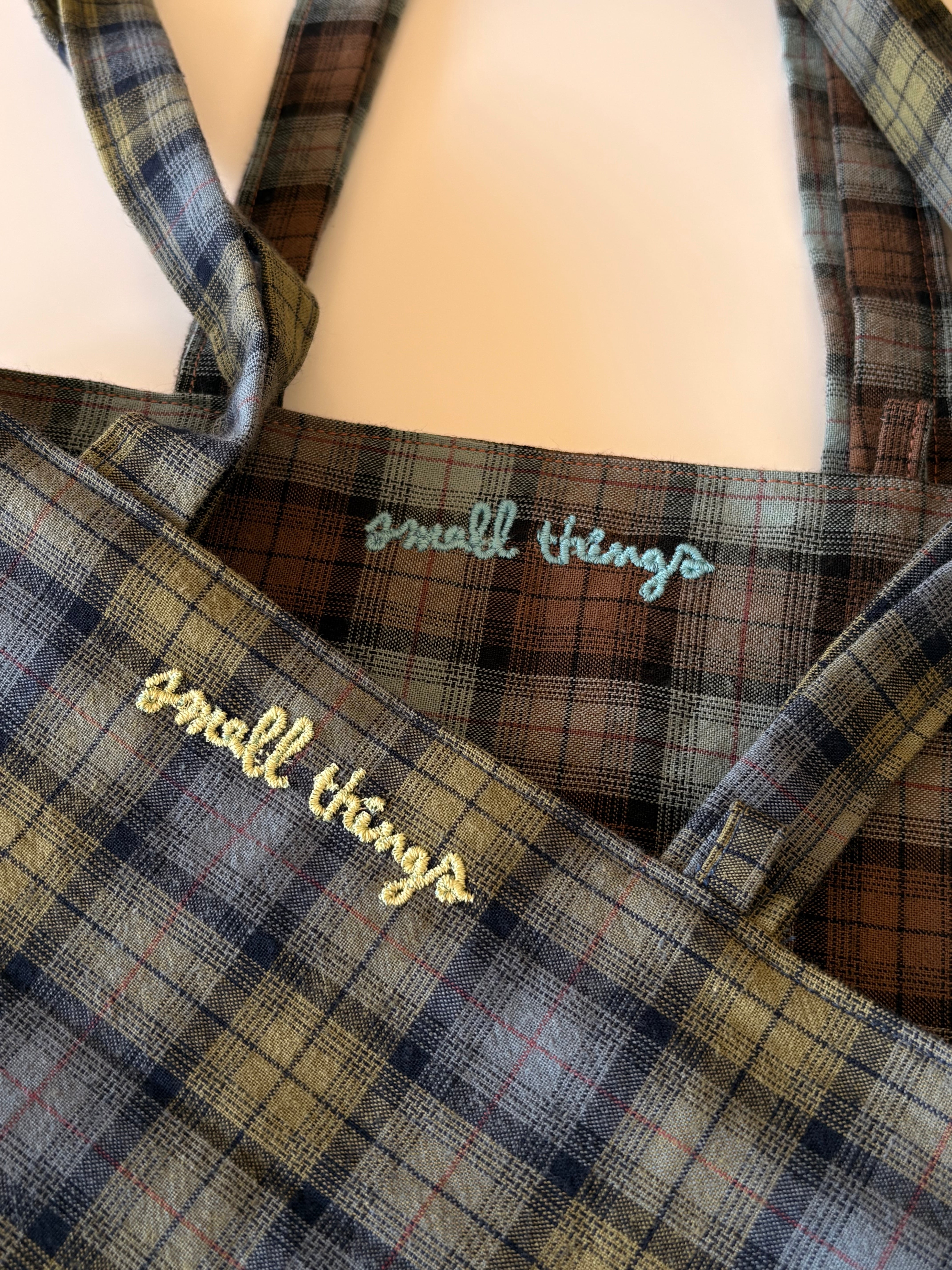 春にぴったりのヴィンテージ風のチェック生地で作ったコットンバックです。 ノートパソコンがぴったり入るサイズで、生地も薄すぎずしっかりして物もたくさん入れることができます。何より色味がとてもきれいで、春夏にたくさん使っていただけると思います!小さな刺繍を入れてアクセントをつけました。 size : 30 x 32 color : light green & blue , blue & brown